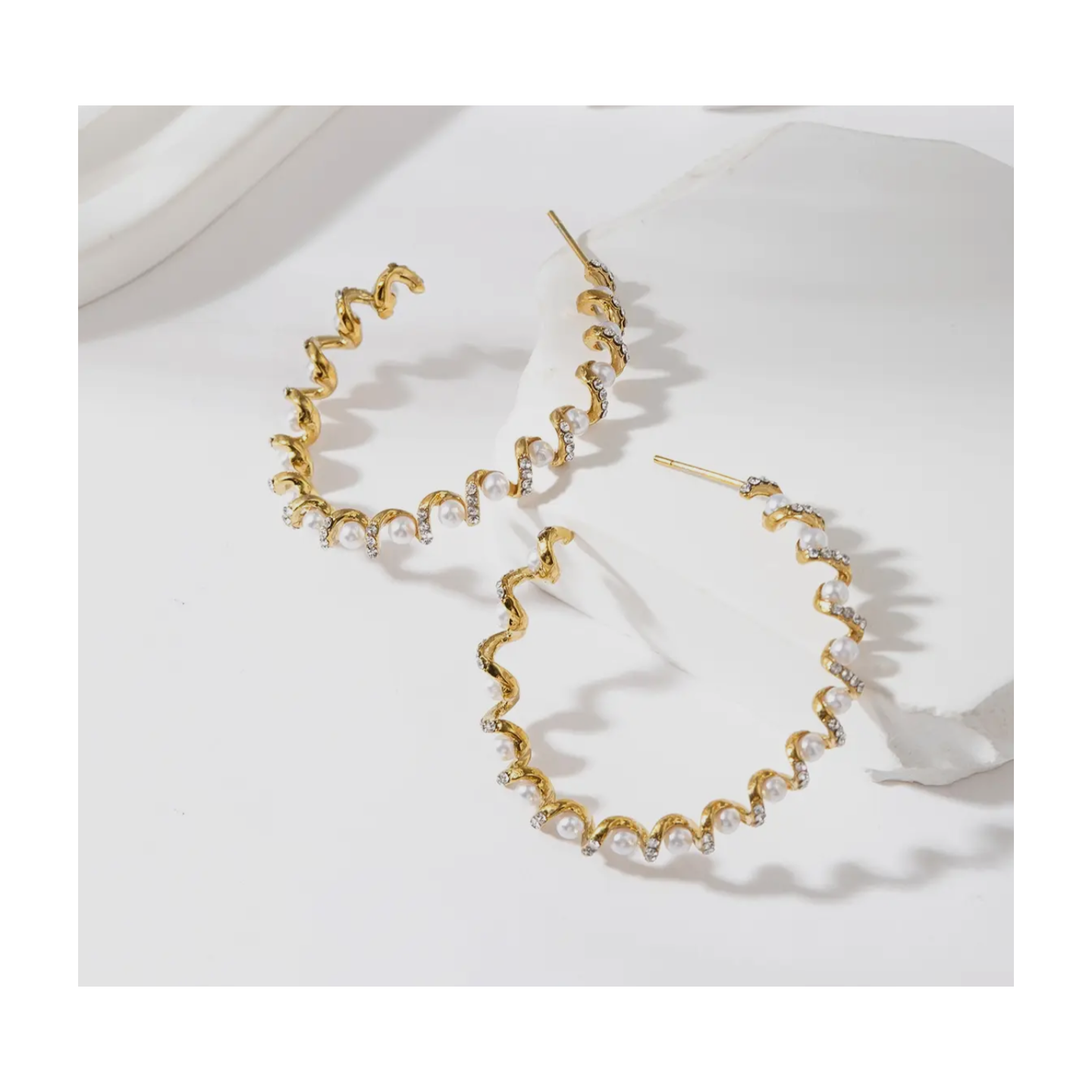 Boucles d'oreilles dorées créoles avec brillants et perles