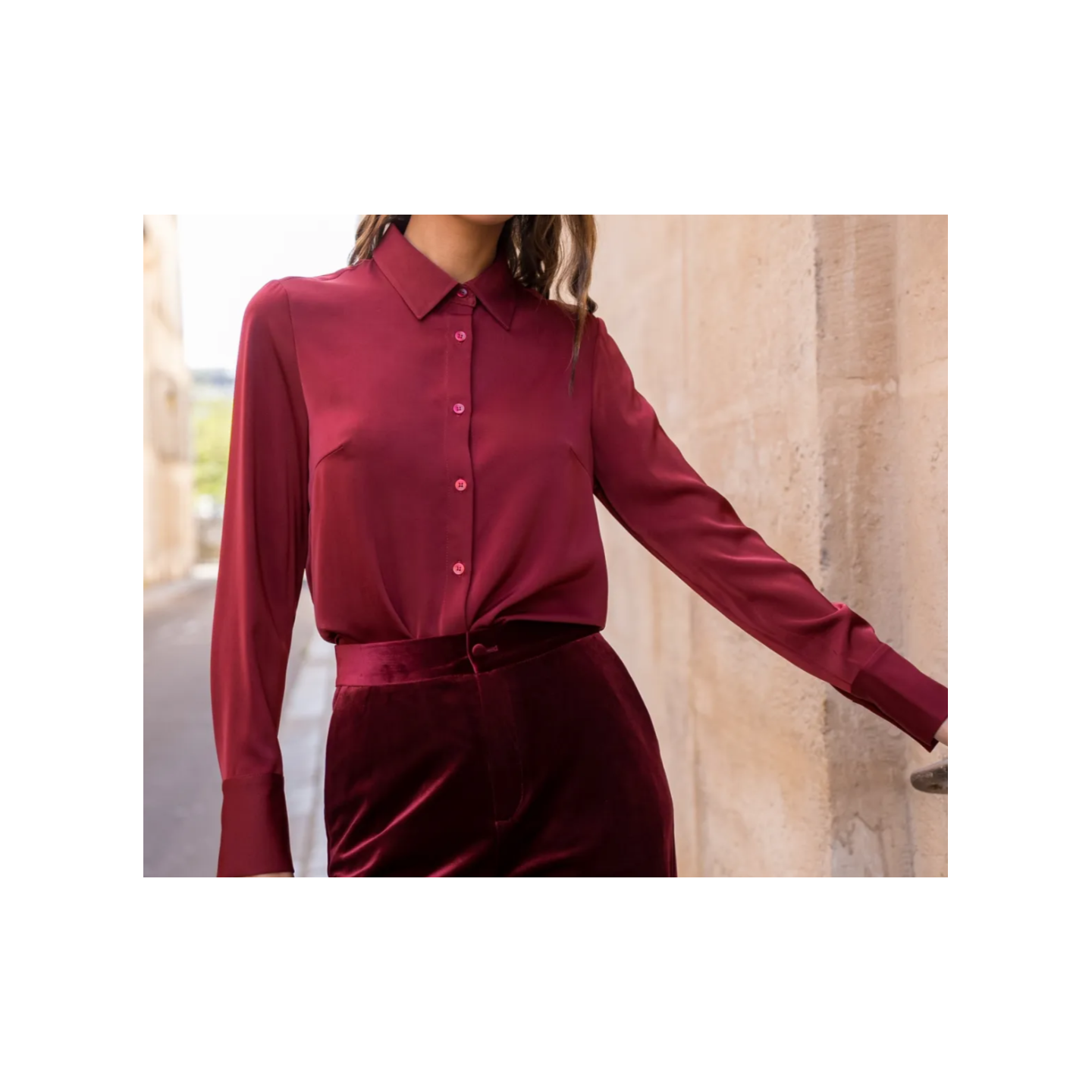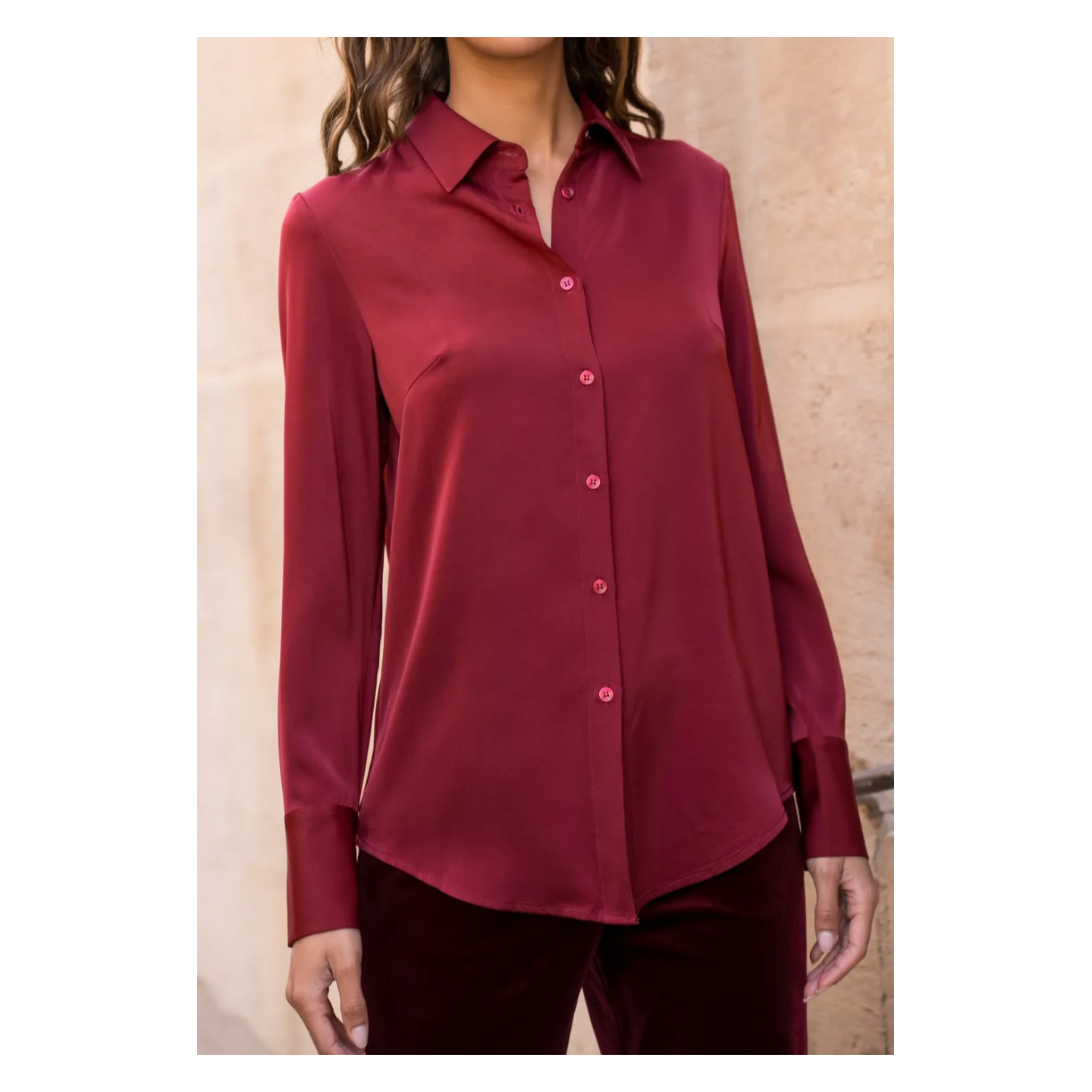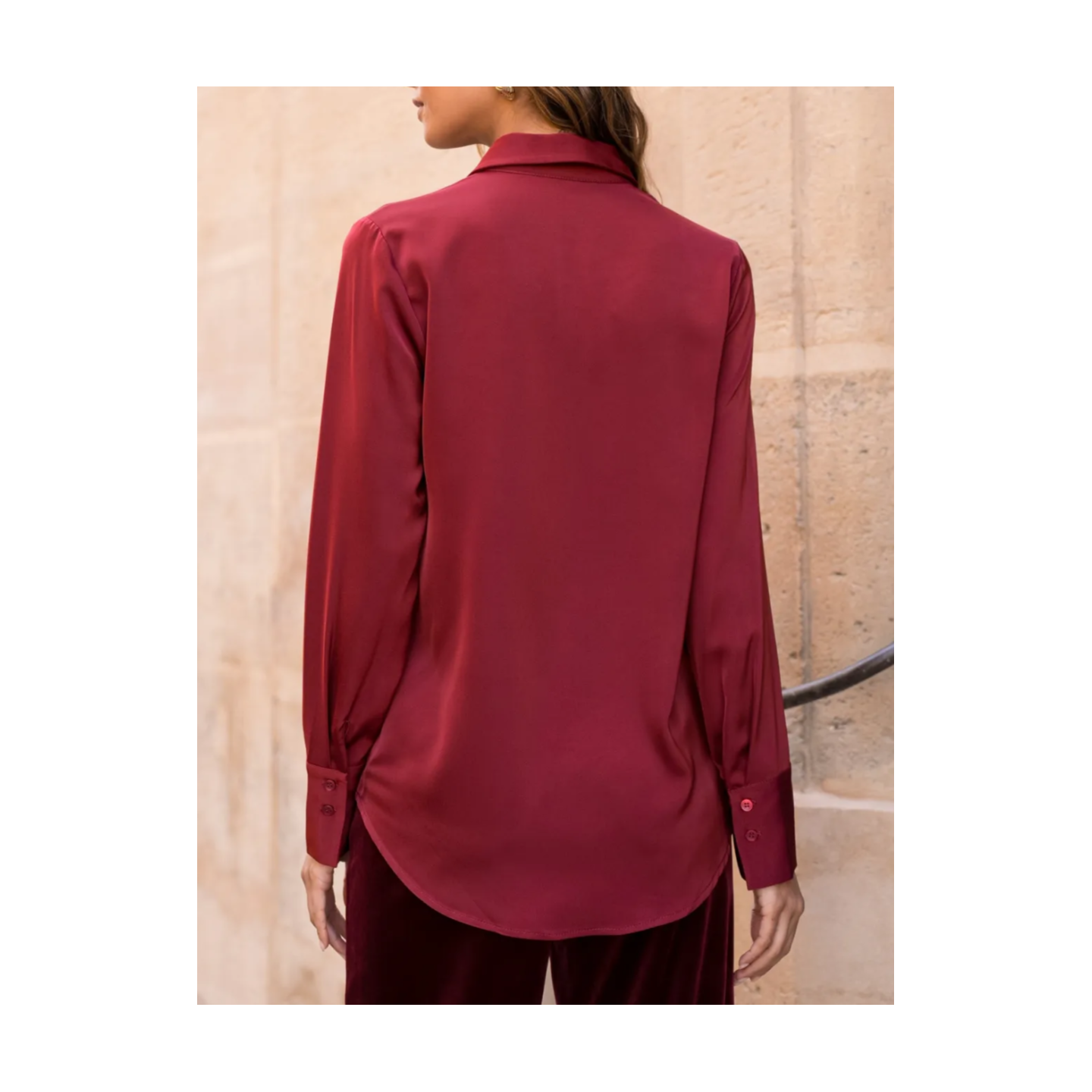 Chemise satinée bordeaux.
