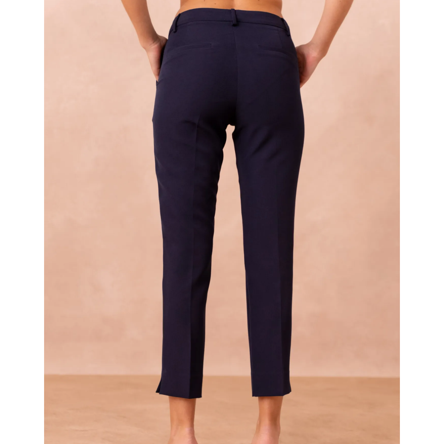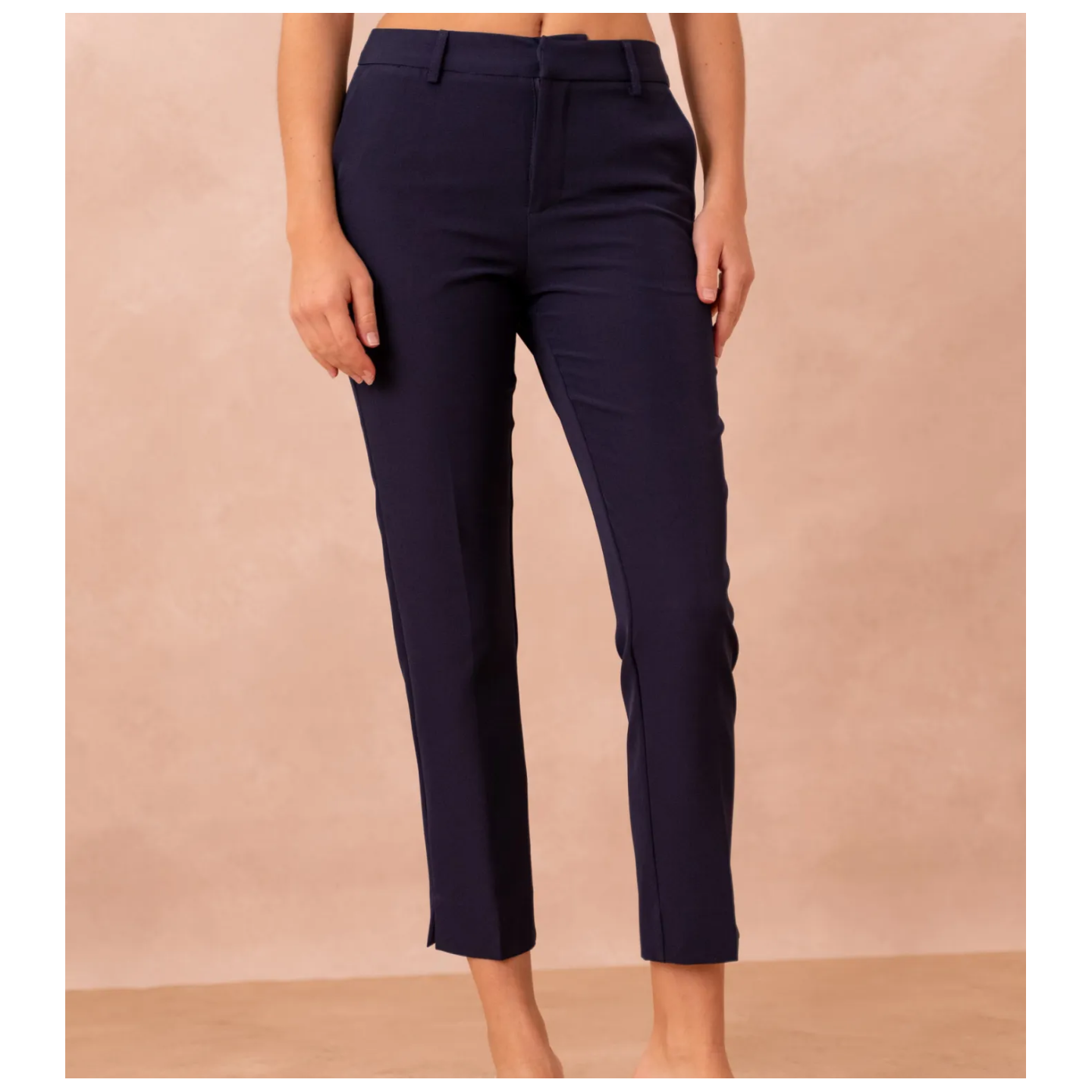 Pantalon coupe cigarette ajustée et élégante. Taille haute avec passants pour ceinture. Fermeture par zip et bouton discret. Plis marqués sur le devant pour une allure structurée. Ourlets larges avec fente sur l’arrière. Poches passepoilées au dos pour une touche sophistiquée.
